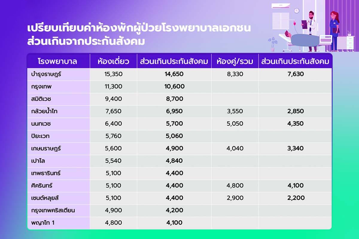 จากการสำรวจราคาค่าห้องพักผู้ป่วย ห้องเดี่ยว และห้องคู่ในโรงพยาบาลเอกชนต่าง ๆ รวมค่าบริการ พยาบาล และอาหาร มีระดับราคาเริ่มต้น ดังนี้