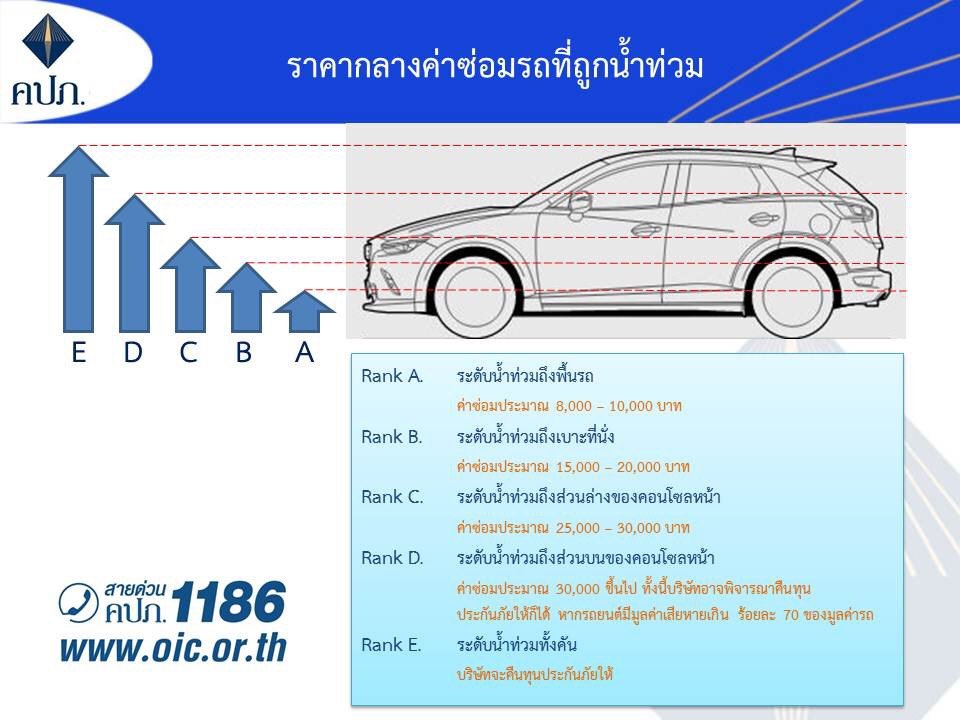 ไม่ต้องตกใจและเป็นกังวลไปเพราะ คปภ. หรือ สำนักงานคณะกรรมการกำกับและส่งเสริมการประกอบธุรกิจประกันภัย ได้ออกแนวปฏิบัติตามมาตรฐานการซ่อมรถยนต์ที่ถูกน้ำท่วมไว้แล้ว เพื่อให้เจ้าของรถใช้เป็นบรรทัดฐานในการเรียกค่าสินไหมทดแทนจากบริษัทประกันภัย รวมถึงให้เจ้าของรถยนต์ที่ถูกน้ำท่วมแต่ไม่ทำประกันใช้เป็นราคากลางในการซ่อม และป้องกันไม่ให้อู่ซ่อมรถยนต์เรียกค่าซ่อมเกินจริง โดยแบ่งเป็น 5 ระดับ คือ